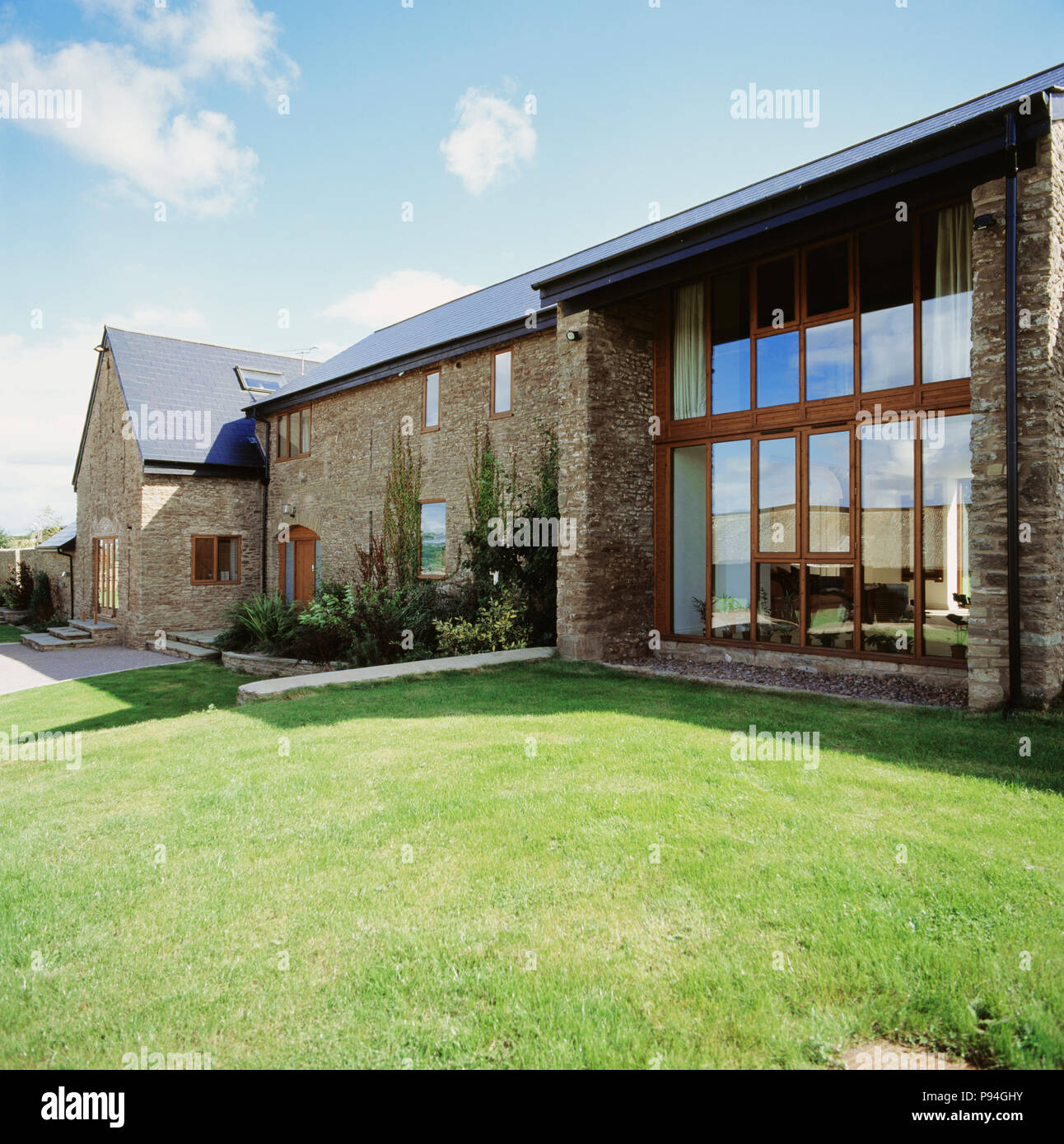 Lawn In Front Of Large Windows On Modern Extension To Traditional Barn Conversion Stock Photo Alamy