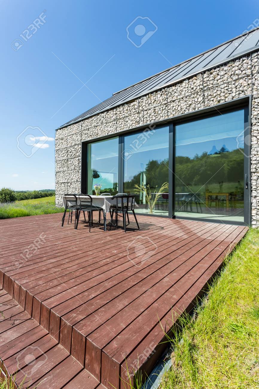 Spacious Wooden Terrace In Front Of A Stone Detached House With Big Garden Stock Photo Picture And Royalty Free Image Image 79794260